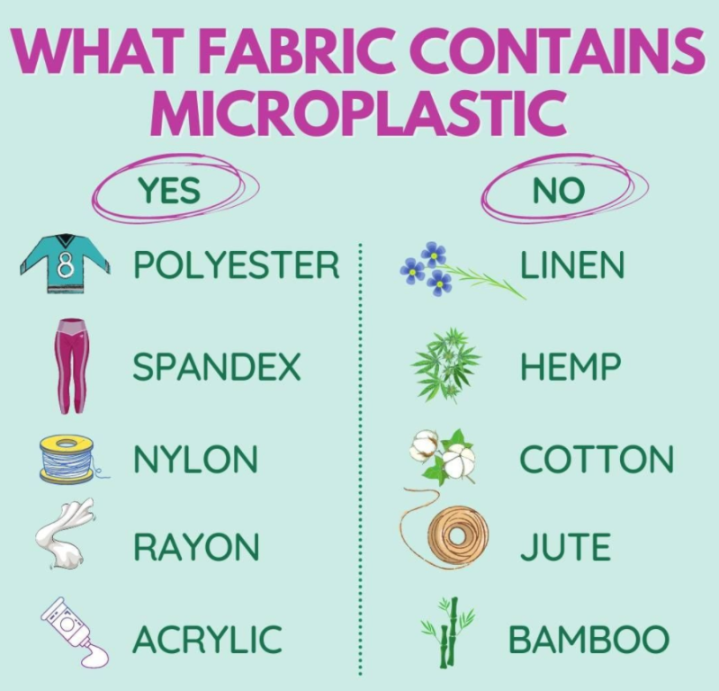 Acryl, polyamide of nylon, polyester, viscose (rayon/ kunstzijde), elasthaan/Spandex/ Lycra®, fleece zijn allemaal stoffen gemaakt vanuit olie en bevatten microplastics. Deze materialen probeer ik te vermijden, dit is vaak lastiger bij zwem of sportkleding, dan probeer ik te zoeken naar gerecycled materiaal.