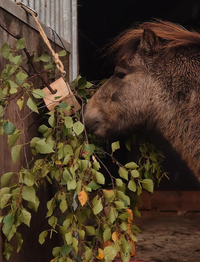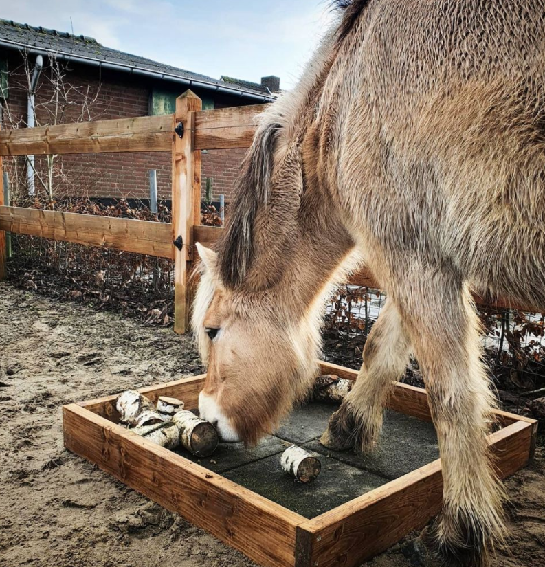 Dat klinkt ingewikkeld, maar dat hoeft het niet te zijn. Je kan dit doen door een plek te maken omringd met wanden, zodat er niks uit valt. De ondergrond kan van steen zijn, of tegels, maar liever geen zand, anders krijgen de paarden dat binnen. Dan kan je er kleine boomstronkjes in doen, of iets anders, wat te bewegen is en daartussen kan je iets te eten leggen. Hierdoor moeten paarden zoeken en geeft dit mentale uitdaging.
